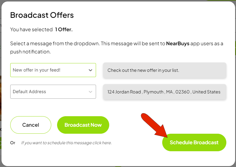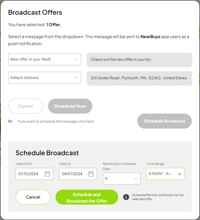 Now, select a start and end date, monthly broadcast date, and time range. Click Schedule and Broadcast the Offer.