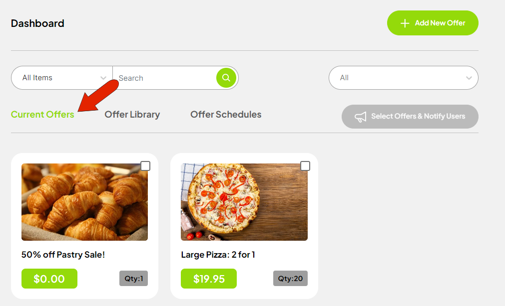 To see all offers that were broadcasted and appear in app user feeds, go to your Dashboard and click Current Offers.