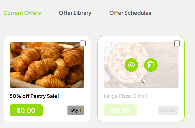 Hovering over a current offer displays icons to edit offer details, or delete the offer.