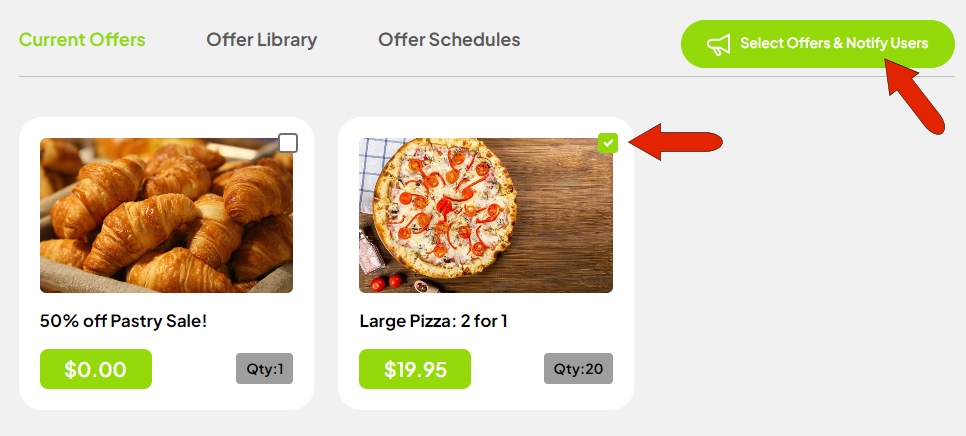 To send a fresh broadcast, or change the broadcast schedule, select the current offer (you can select multiple offers if needed). Then click Select Offers & Notify Users.