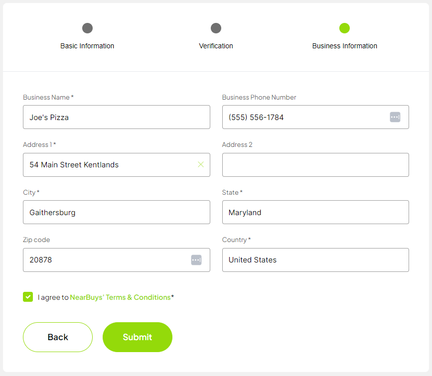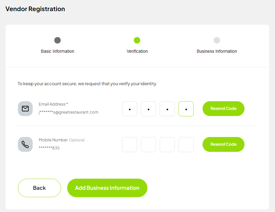 Next, enter the four-digit code sent to your email or phone. If the codes expire, use the Resend Code buttons. Then proceed to Add Business Information.