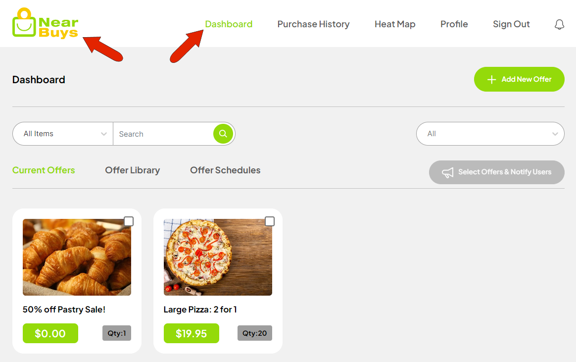 Here, you can create a new offer, view your current (active) offers and offer library, schedule broadcasts review consumer requests and view the Insights Page.