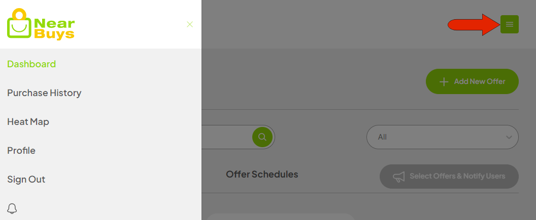 To return to the Dashboard, click the three-line icon at the top right to open the menu on the left.